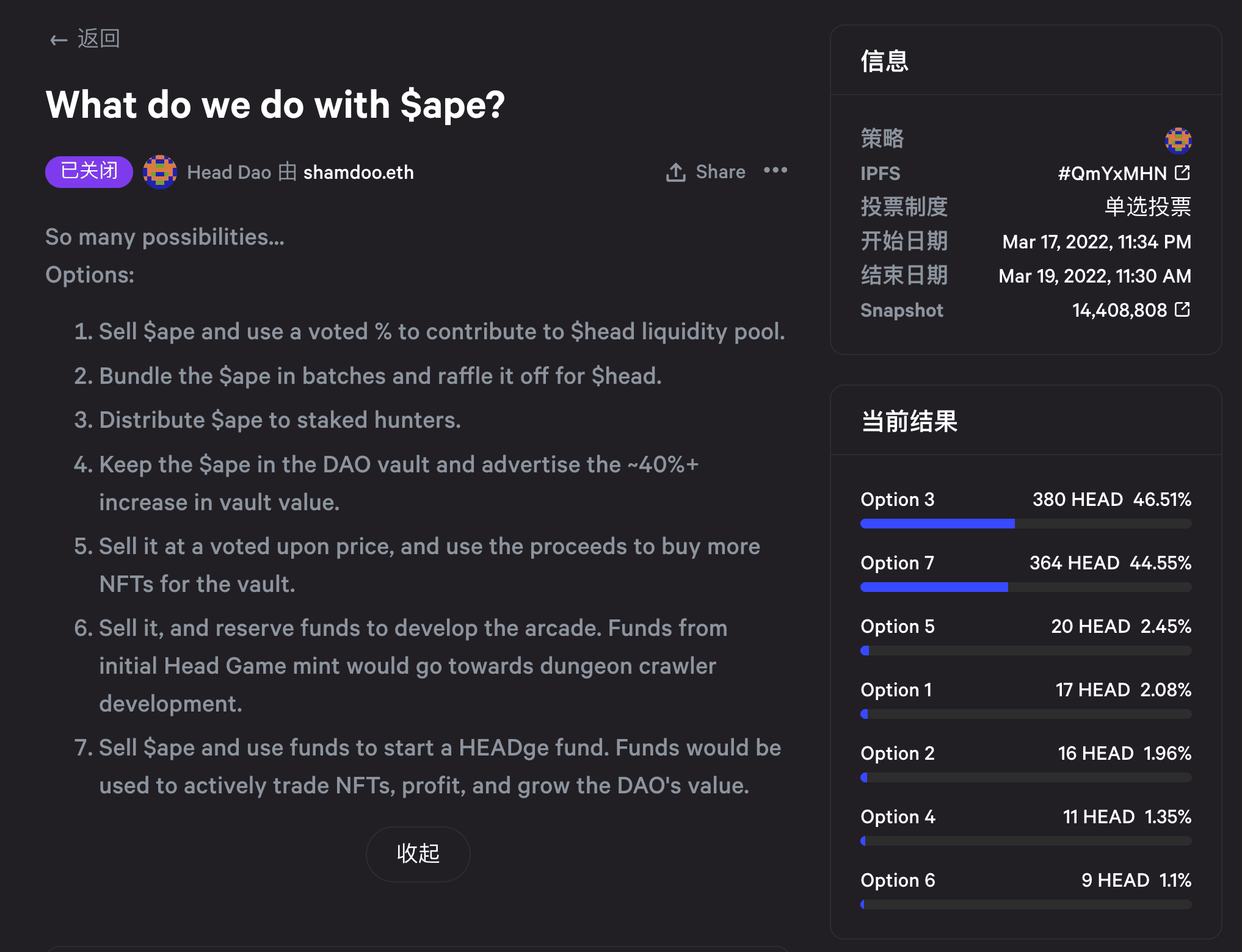 HeadDAO,我參加的一個 DAO,簡單解釋就是集資投資 NFT ,上週發生了一件事,完全體現了 DAO 的失能。我們的金庫裡有幾隻 BYAC,前一陣子空頭$APE 我們也有拿到,但是管理者竟然提了一個有七個選項的投票,其中一個直接讓少數人分了那些$APE,投票率超低的狀況下,那個很扯的選項就這樣過了。社群裡大家當然炸裂了,只好再辦一個否決前面決策的投票,我還到台灣人的 Line 群組裡懇請大家記得去投票。雖然我早就沒有太投入其中(因為經營狀況低落),但是整件事還是令人莞爾,去中心化的自治真的適合所有人嗎?光用投票真的能解決問題嗎?